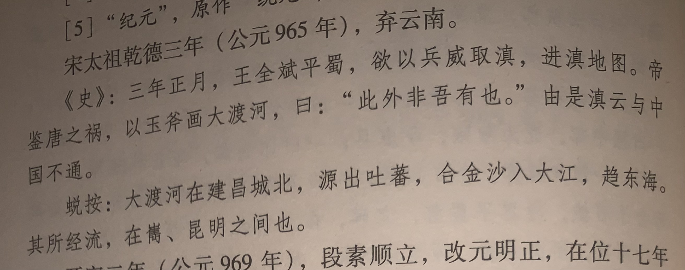 《滇云历年传》:三年正月,王全斌平蜀,欲以兵威取滇,进滇地图。帝鉴唐之祸,以玉斧画大渡河,曰:“此外非吾有也。”由是滇云与中国不通。(图一)